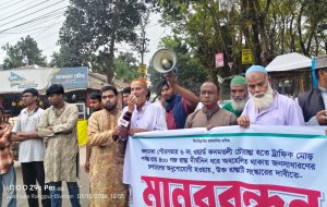 মানববন্ধনে বক্তব্য রাখেন উপজেলা পরিষদের ভাইস চেয়ারম্যান পদপ্রার্থী আসিফ ইকবাল সাজু। তিনি বলেন, এই সড়কটি শুধু একটি এলাকার নয়, পুরো পৌরশহরের মানুষের জন্য গুরুত্বপূর্ণ। কিন্তু বছরের পর বছর ধরে সড়কটির এমন বেহাল দশা থাকলেও সংশ্লিষ্ট কর্তৃপক্ষের তেমন কোনো কার্যকর উদ্যোগ দেখা যায়নি। সামান্য বৃষ্টিতেই রাস্তা পানিতে তলিয়ে যায় এবং চলাচল মারাত্মকভাবে ব্যাহত হয়। এতে সাধারণ মানুষের ভোগান্তি চরমে পৌঁছেছে। তিনি দ্রুত সময়ের মধ্যে সড়ক সংস্কার ও স্থায়ী ড্রেনেজ ব্যবস্থা চালুর জন্য সংশ্লিষ্ট কর্তৃপক্ষের প্রতি আহ্বান জানান।